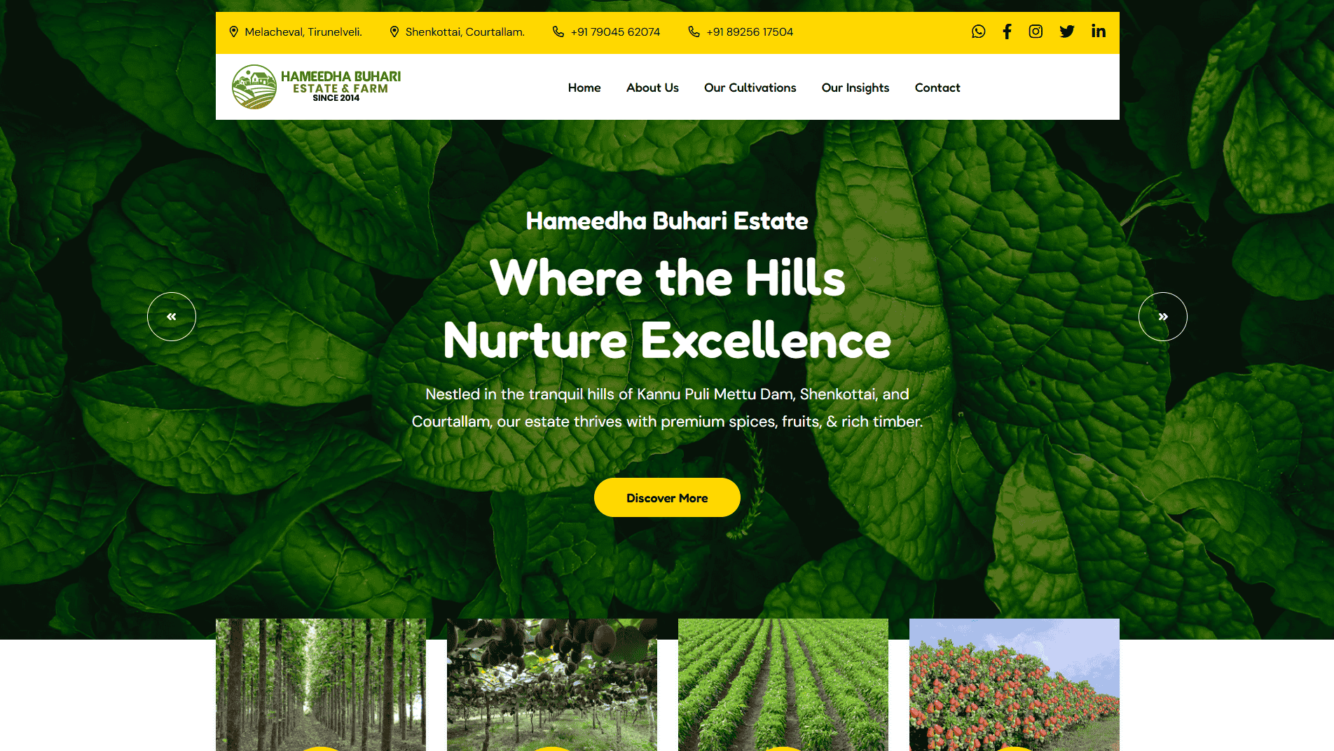 WebsiteSince 2014, Hameedha Buhari Farm & Estate has been committed to sustainable agriculture. From Melkarai to the hills of Shenkottai and Courtallam, we cultivate timber, spices, fruits, and grains using a blend of traditional wisdom and modern practices—ensuring quality while protecting the environment.