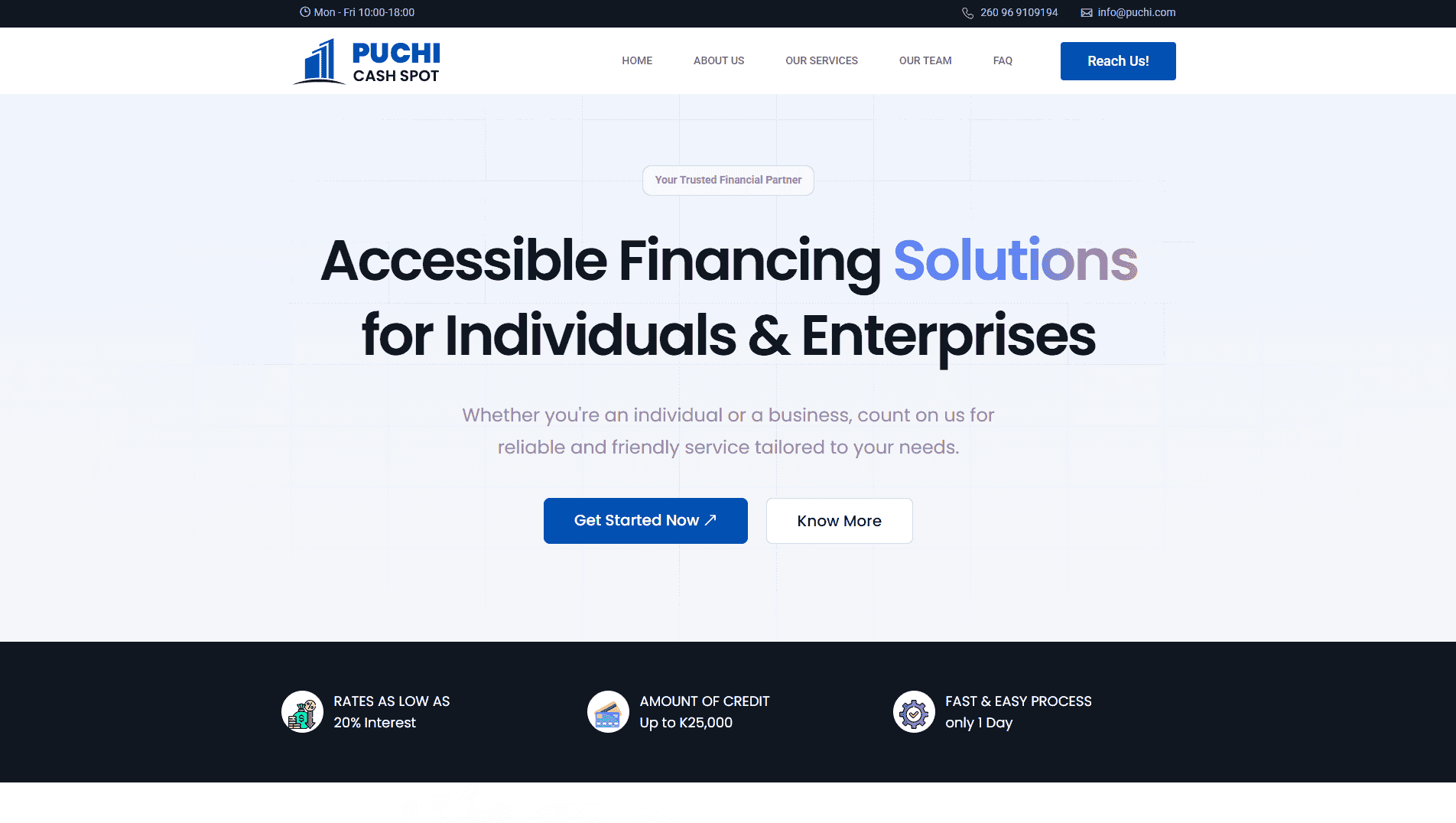WebsitePuchi Cash Spot Finance, regulated by the Bank of Zambia, provides innovative short-term financing solutions for individuals and SMEs. With a dynamic team and over 50 partners, we serve 1,000+ clients, bridging financial service gaps efficiently and reliably.