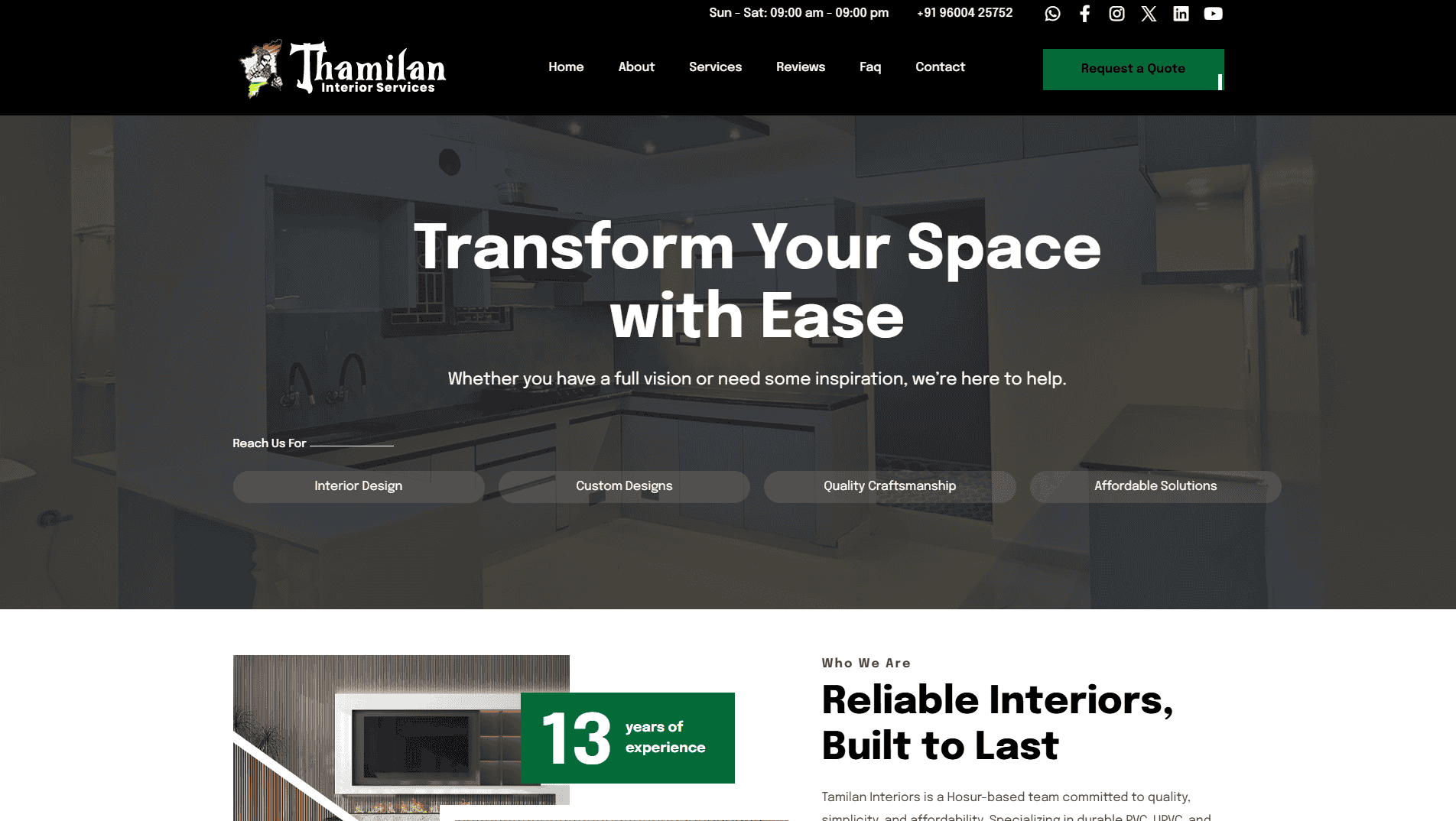 WebsiteTamilan Interiors, based in Hosur, specializes in durable, affordable PVC, UPVC, and aluminum interior designs for homes and businesses. With 13 years of experience, we deliver customized, high-quality, and transparent solutions—combining innovation, functionality, and style to transform your space effortlessly.