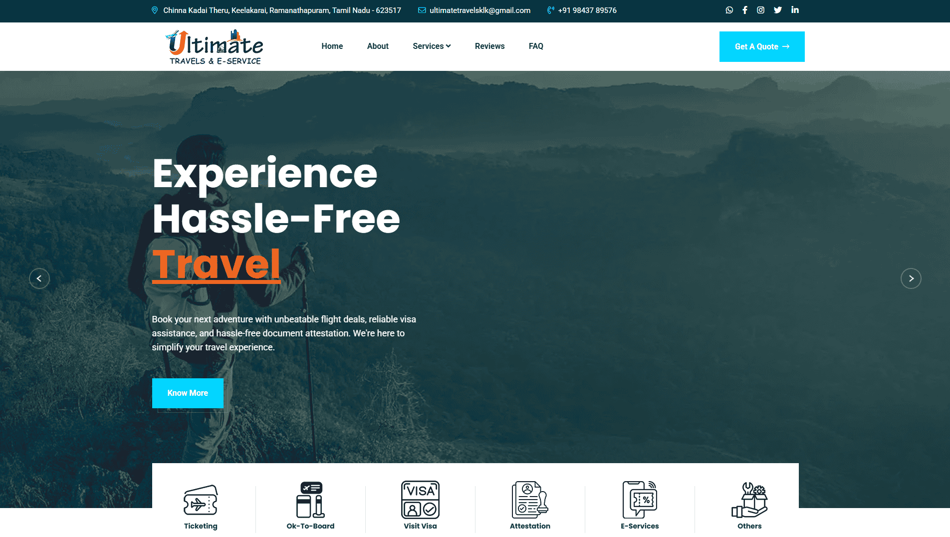 WebsiteUltimate Travels & E-Service, based in Keelakarai, Tamil Nadu, offers reliable travel and e-service solutions tailored to your needs. From local to international travel, we ensure a smooth, hassle-free experience with a focus on convenience and personal care.